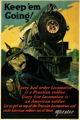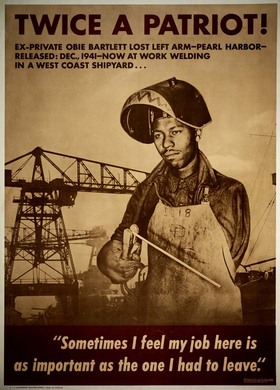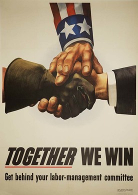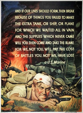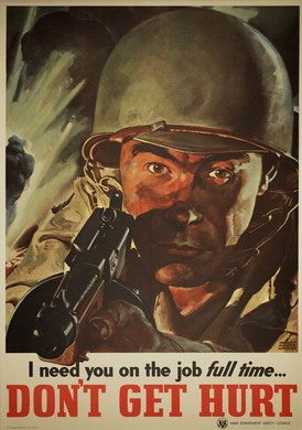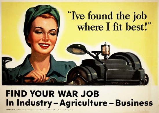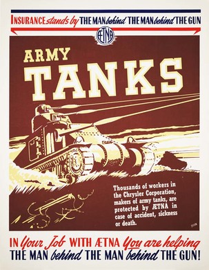 During World War I (1914-1918) and World War II (1939-1945), both government and private enterprise used posters to connect work being done in American factories with supplies and equipment being used by the military. After the periods of isolationism that preceded each war, factory owners sought to charge workers with a sense of mission, hoping to increase productivity and avert costly labor strikes. And as men left for service overseas, many positions were being filled by workers new to those industries, particularly women.